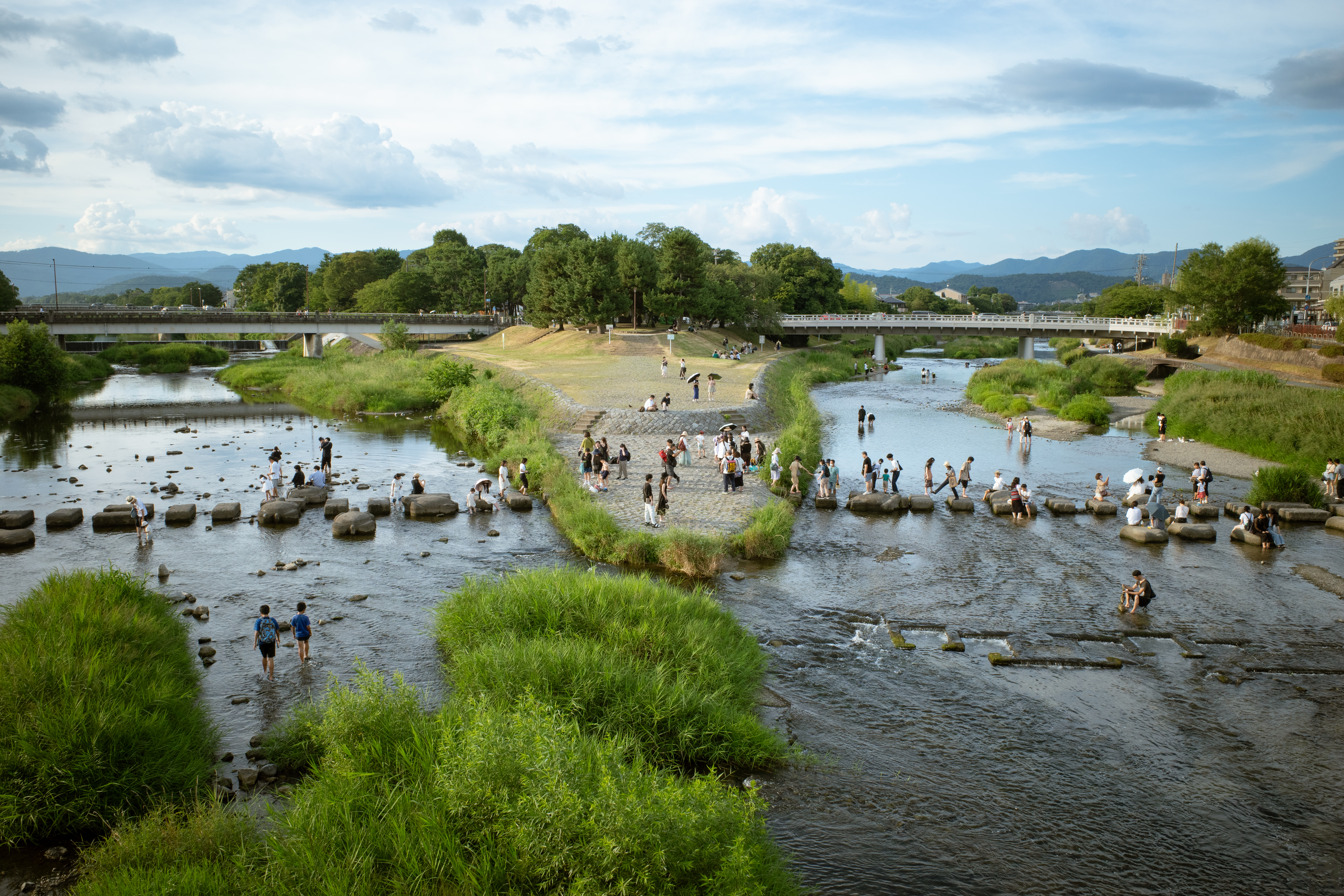 今回の展示では、本シリーズの中から、賀茂大橋の上から鴨川デルタを見下ろす視点で定点的に撮影された作品に焦点を当てます。花火や大学生のイベント、散歩といった人々の営みとともに、光や天候、季節の移ろいといった自然界の変化もまた、同じ画面の中に捉えられています。賀茂川と高野川という二つの川が合流し、鴨川となるこの場所に現れる、さまざまな人々のふるまいが、写真を連続して展示することで次第に浮かび上がってきます。それは風景写真でもあると同時に、時間をかけて一つの場所と向き合う、ささやかなタイポロジーの試みのようでもあります。