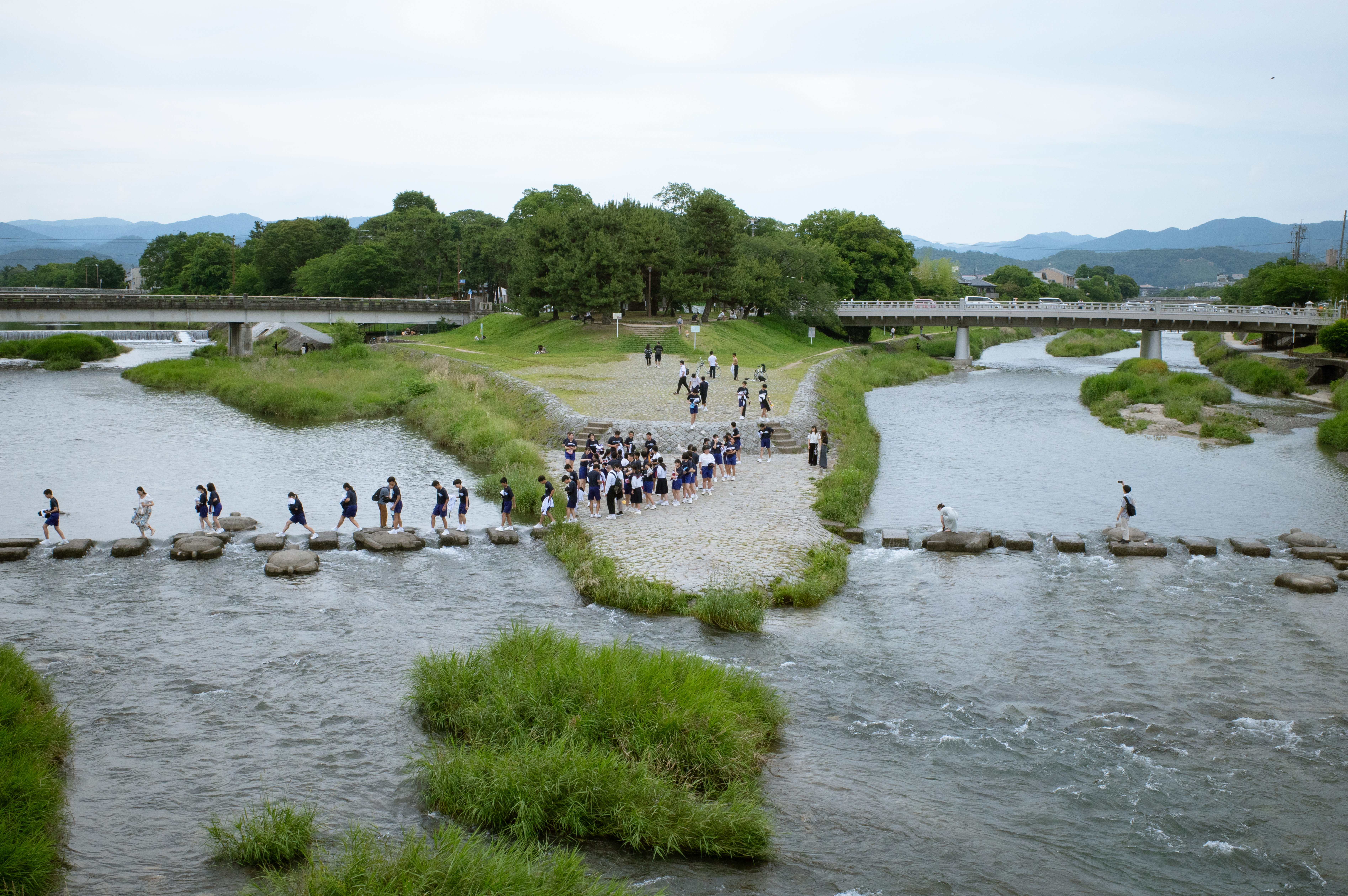 今回展示する作品は、かわえみが京都・出町柳に位置する鴨川デルタを舞台に、2022年から撮影を続けている同名のシリーズです。犬の散歩をする人や自転車で家路を急ぐ人、旅行客、修学旅行生、大学生たちのイベントなど、日常と非日常が交差するこの場所を行き交う人々の姿が写しとられています。